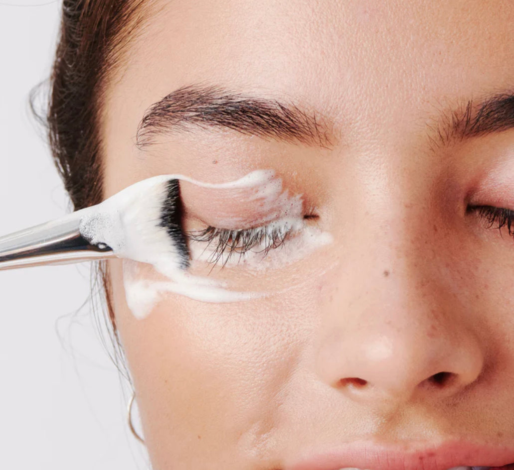 Dispense a dime-sized amount of Lash Bath into your clean palm. Then wet your fluffy cleansing brush with cool water and swirl in Lash Bath to create a lather. Apply to lids and gently brush through lashes in a downward motion over the top of lashes and then side to side on your lids and under eye area. To finish, wet your brush with cold water and rinse lids and lashes. Pat dry.