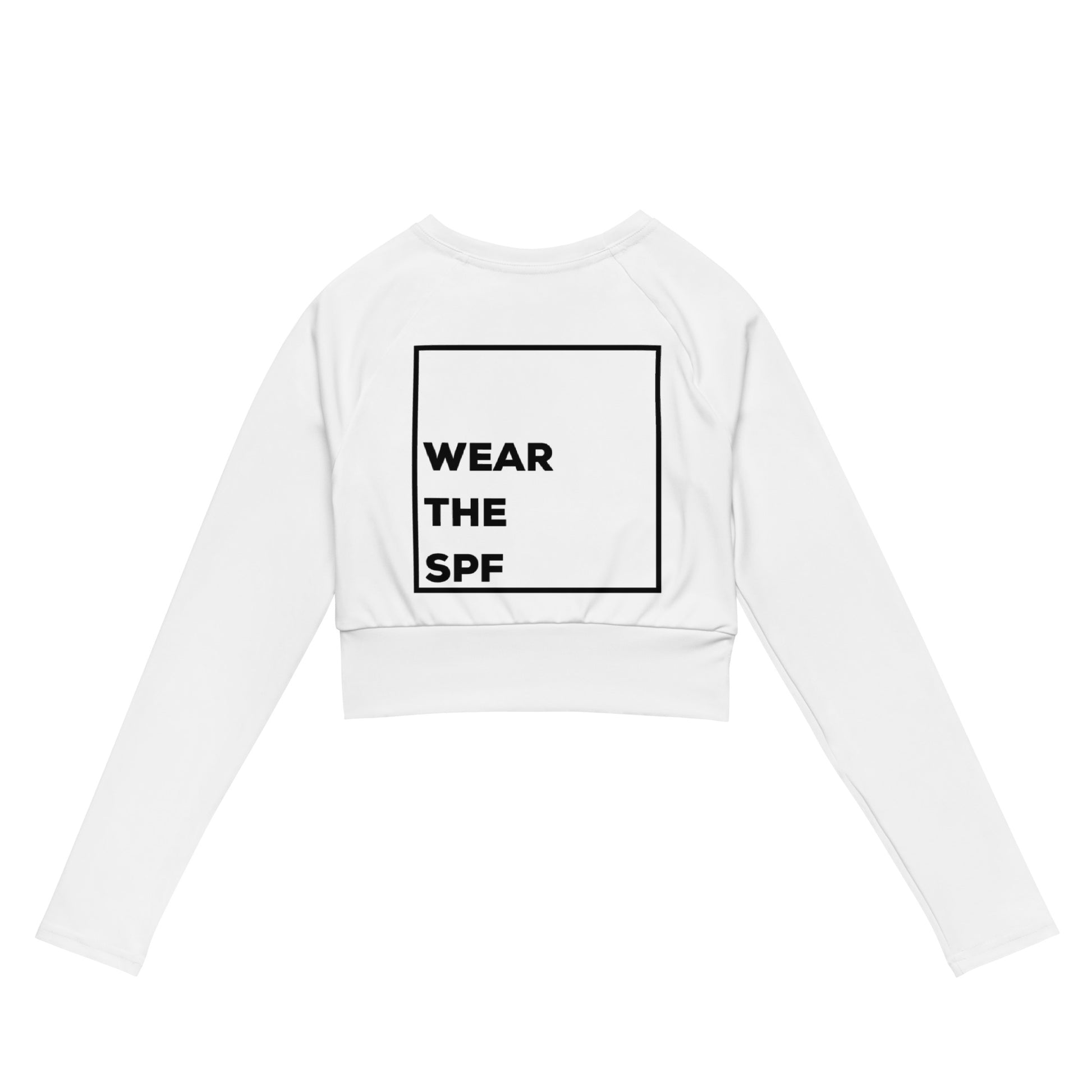 This long-sleeve crop top is made of recycled polyester and elastane, making it an eco-friendly choice for swimming, sports, or athleisure outfits. The crop top has a tear-away care label and a wide, double-layered waistline band for a comfortable fit.