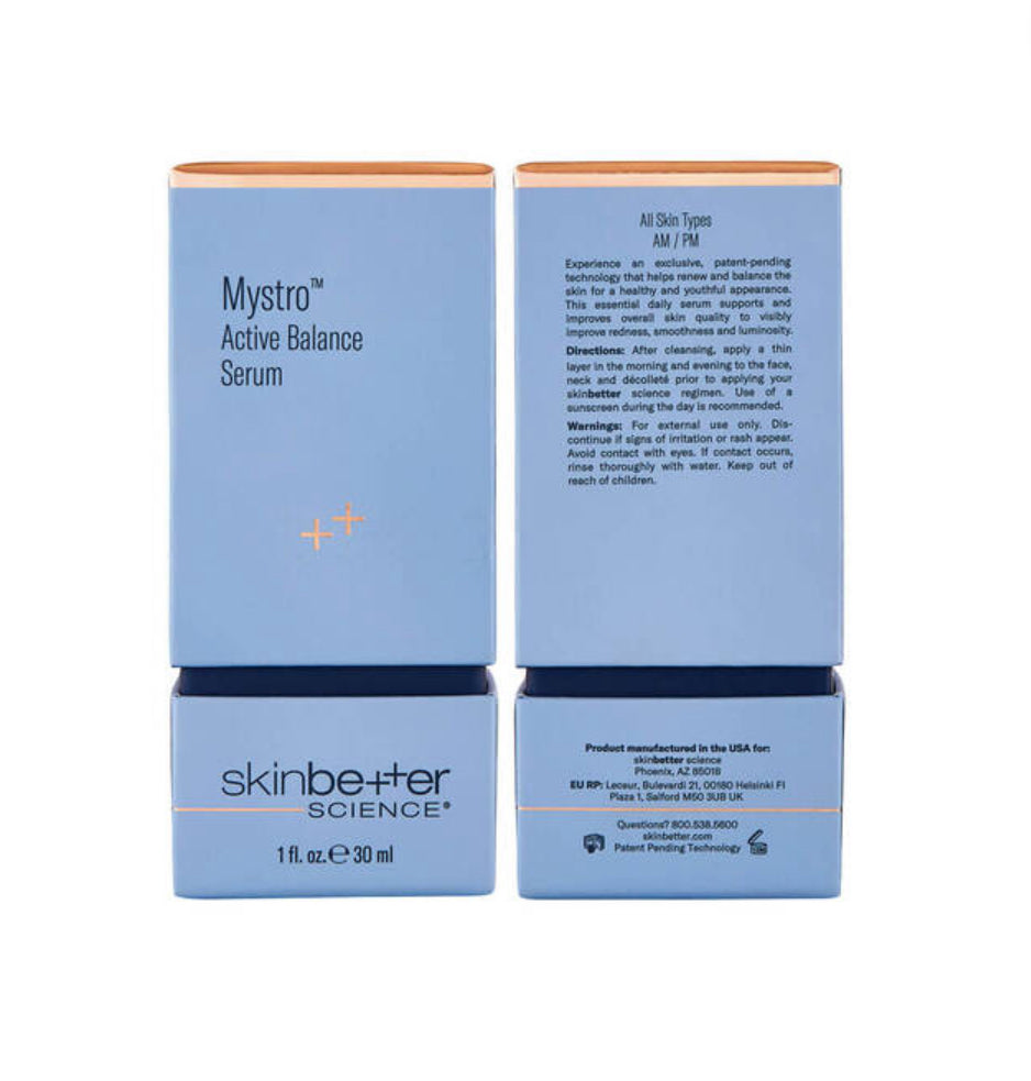 A 12-week, dermatologist-led clinical trial evaluated improvements in appearance and patient satisfaction from baseline in 53 patients with mild-to-severe photodamaged skin. Mystro Active Balance Serum was used twice daily in conjunction with a gentle cleanser (AM/PM), Hydration Boosting Cream (AM/PM) and sunbetter SHEER SPF 56 Sunscreen Stick (AM).